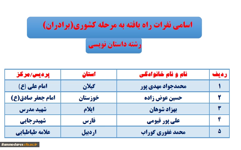 اسامی نفرات راه یافته به مرحله کشوری بیست وهفتمین جشنواره فرهنگی دانشجومعلمان دانشگاه فرهنگیان پردیس شهید مدرس ایلام 4