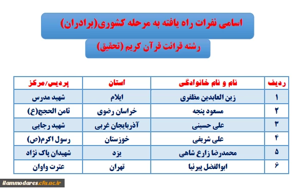 اسامی نفرات راه یافته به مرحله کشوری بیست وهفتمین جشنواره فرهنگی دانشجومعلمان دانشگاه فرهنگیان پردیس شهید مدرس ایلام 9