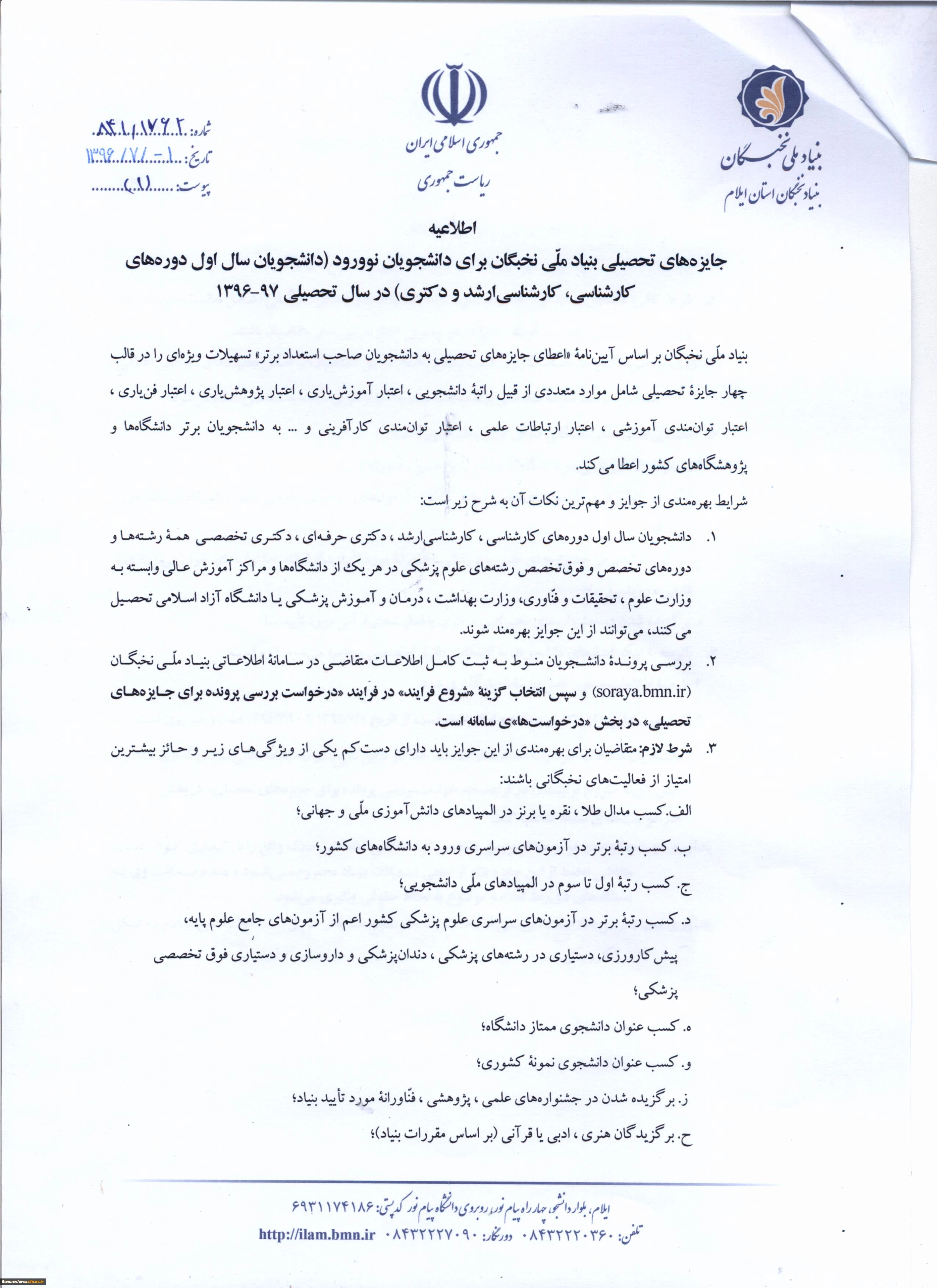 آغاز فراخوان ثبت نام (( جایزه های تحصیلی بنیاد ملی نخبگان )) جهت دانشجویان نوورود به دانشگاه در سال تحصیلی 97-1396 ، از تاریخ 1396/07/01 لغایت 1396/07/20  2