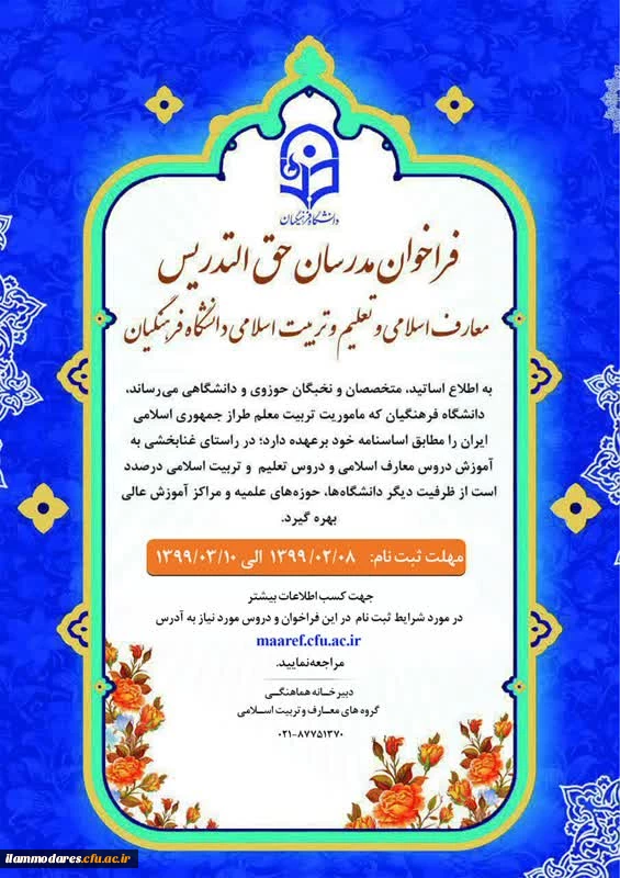 طرح شناسه تدریس و فراخوان مدرسان حق التدریس معارف اسلامی و تعلیم و تربیت اسلامی دانشگاه فرهنگیان 2