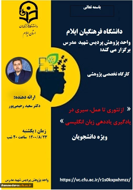 امتیاز دهید : کارگاه تخصصی پژوهشی « ازتئوری تا عمل، سیری در یادگیری یاددهی زبان انگلیسی » 2 دوشنبه 24 آبان 1400 ساعت 13:35
